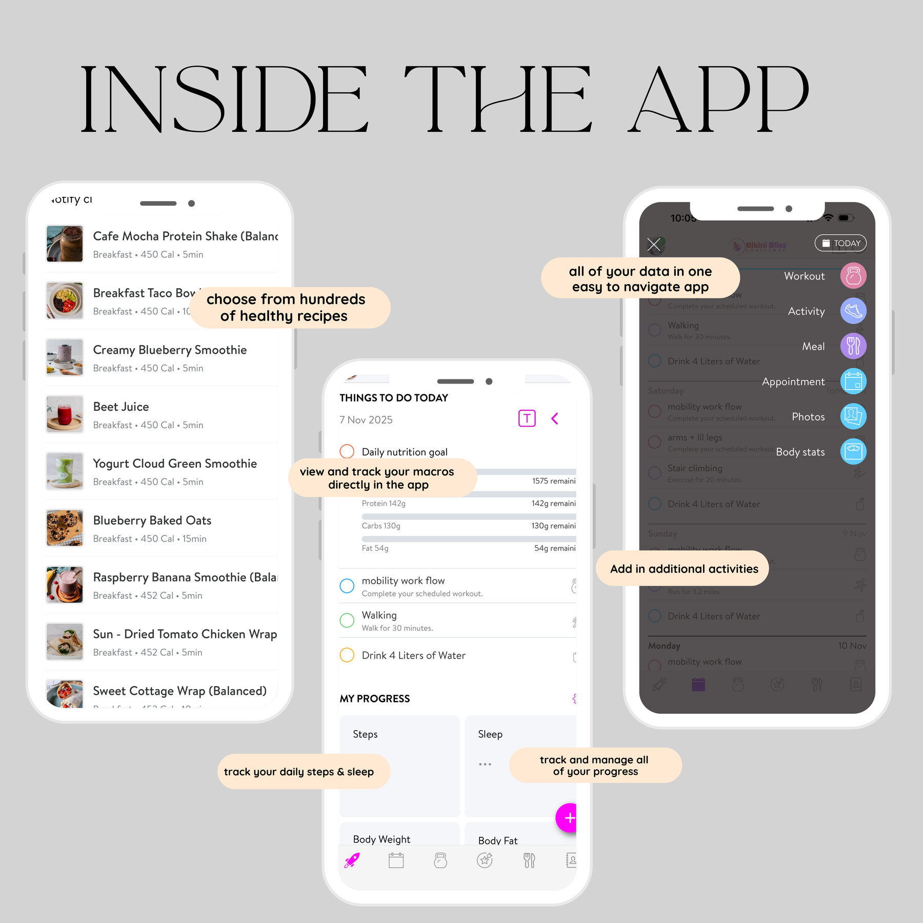 Track and Review your Progress each week directly in your app profile. By tracking your weekly progress with stats (photos, weight, body measurements) you have a much higher success rate in reaching your goals.